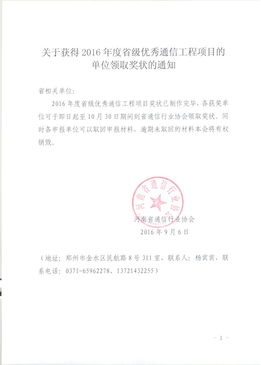關(guān)于獲得2016年度省級(jí)優(yōu)秀通信工程項(xiàng)目的單位領(lǐng)取獎(jiǎng)狀的通知