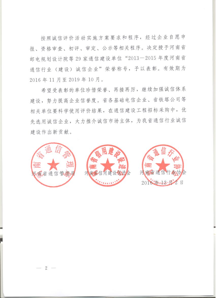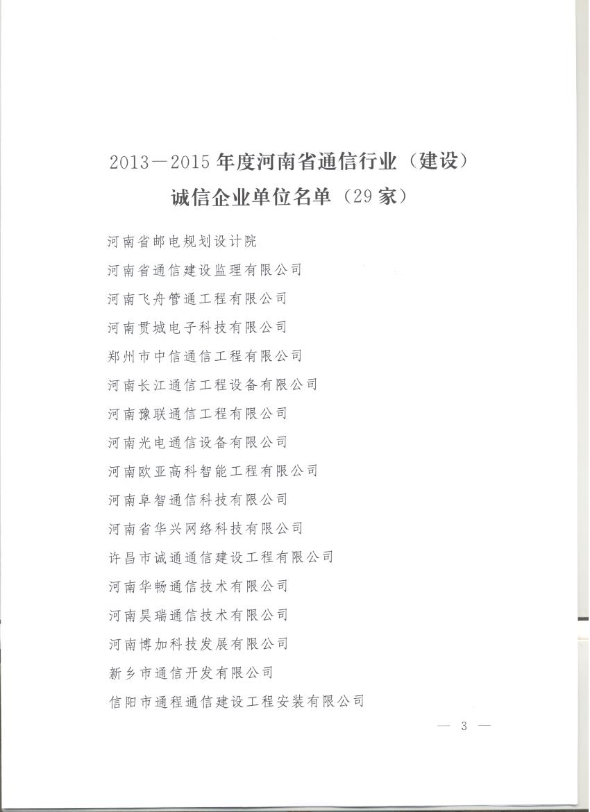 河南省通信管理局 河南省信用建設(shè)促進(jìn)會(huì) 河南省通信行業(yè)協(xié)會(huì)關(guān)于表彰2013—2015年度河南省通信行業(yè)誠(chéng)信企業(yè)的通報(bào)