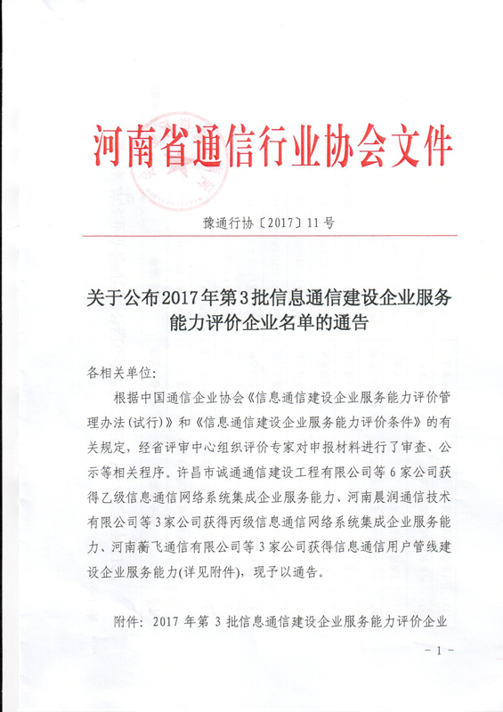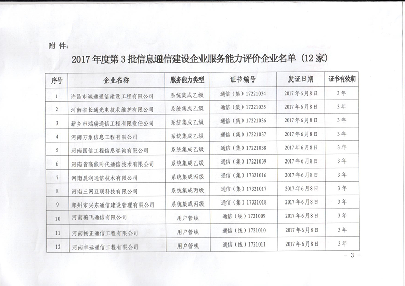 關于公布2017年第3批信息通信建設企業(yè)服務能力評價企業(yè)名單的通告