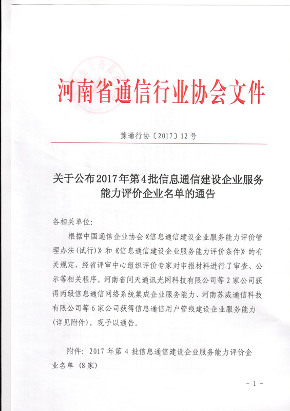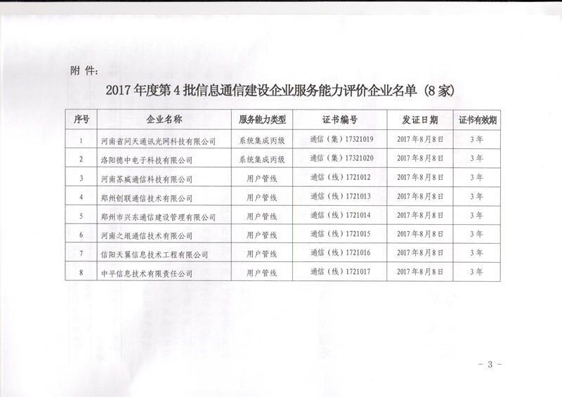 關(guān)于公布2017年第4批信息通信建設企業(yè)服務能力評價企業(yè)名單的通告