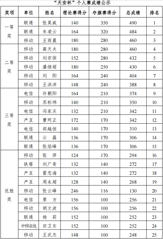 1、本次競賽賽項(xiàng)有個(gè)人賽、團(tuán)隊(duì)賽、方案賽:個(gè)人賽獎(jiǎng)項(xiàng)設(shè)置為一等獎(jiǎng) 3 名、二等獎(jiǎng) 5 名、三等獎(jiǎng) 7 名、優(yōu)勝獎(jiǎng) 10 名;團(tuán)隊(duì)賽獎(jiǎng)項(xiàng)設(shè)置為一等獎(jiǎng) 1 名、二等獎(jiǎng) 1 名、三等獎(jiǎng) 1 名;方案賽獎(jiǎng)項(xiàng)設(shè)置為一等獎(jiǎng) 1 名、二等獎(jiǎng) 3 名、三等獎(jiǎng) 5 名、優(yōu)勝獎(jiǎng)13名。排名按總成績從高到低排序。