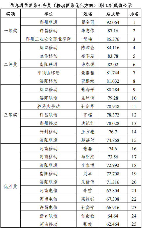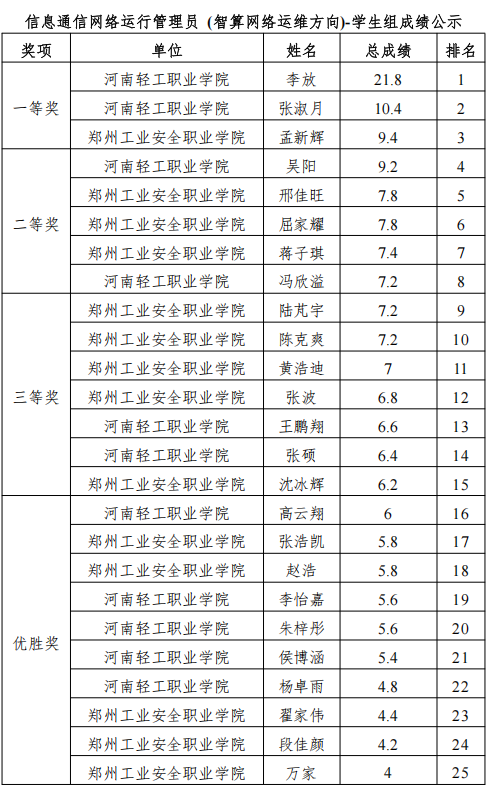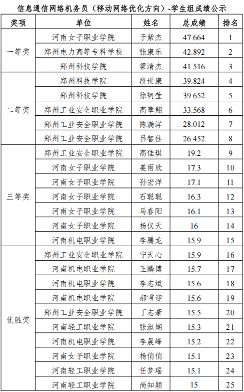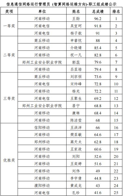 1.本次競賽賽項為信息通信網(wǎng)絡(luò)機務(wù)員 (移動網(wǎng)絡(luò)優(yōu)化方向)& 信息通信網(wǎng)絡(luò)運行管理員 (智算網(wǎng)絡(luò)運維方向),獎項設(shè)置為一等獎 3 名、二等獎 5 名、三等獎 7 名、優(yōu)勝獎 10 名,排名按總成績從高到低排序。