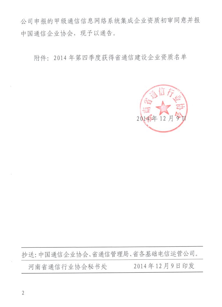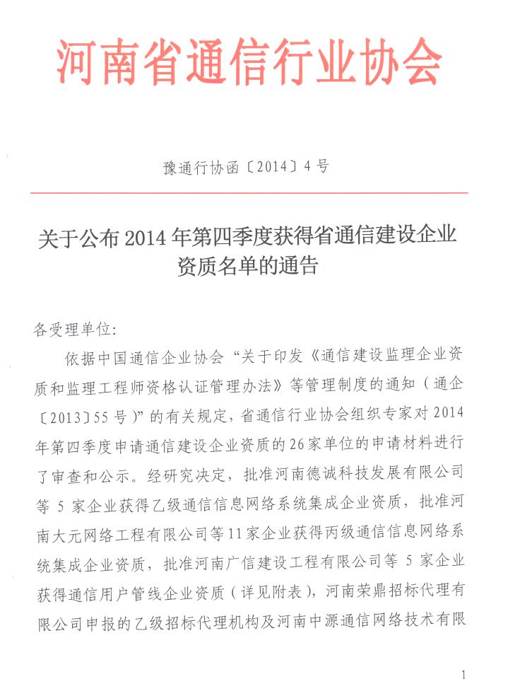 關(guān)于公布2014年第4季度獲得省通信建設(shè)企業(yè)資質(zhì)名單的通告
