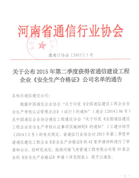 關(guān)于公布2015年第2季度獲得通信建設(shè)工程企業(yè)《安全生產(chǎn)合格證》的通告