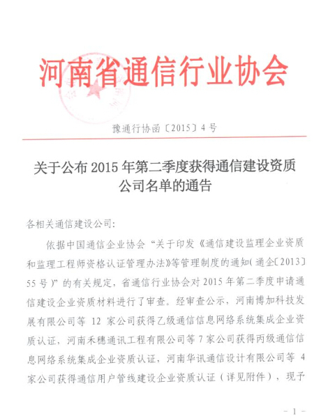 關(guān)于公布2015年第2季度獲得省通信建設(shè)企業(yè)資質(zhì)名單的通告