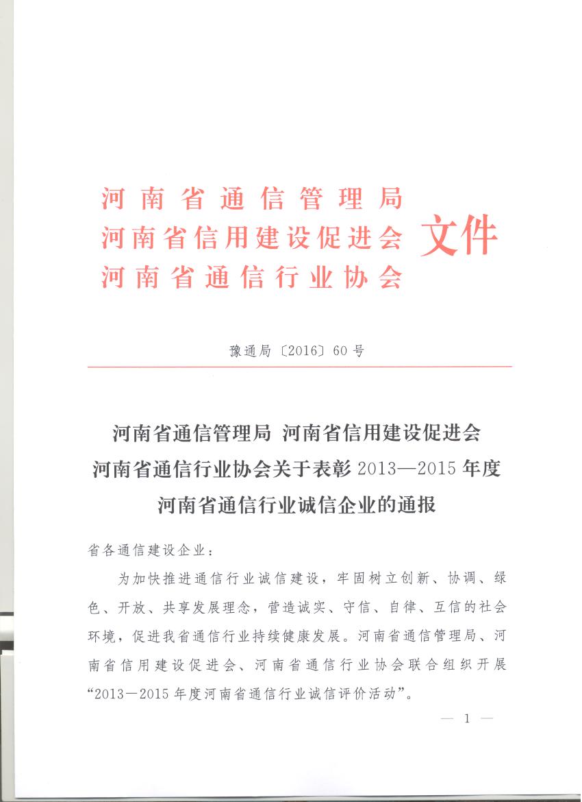 河南省通信管理局 河南省信用建設(shè)促進(jìn)會(huì) 河南省通信行業(yè)協(xié)會(huì)關(guān)于表彰2013—2015年度河南省通信行業(yè)誠(chéng)信企業(yè)的通報(bào)