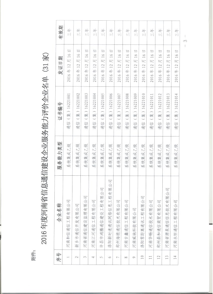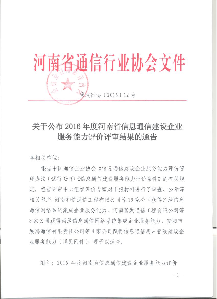 關(guān)于公布2016年度河南省信息通信建設(shè)企業(yè)服務(wù)能力評(píng)價(jià)評(píng)審結(jié)果的通告