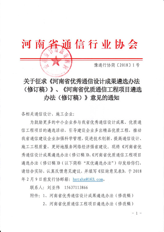 關(guān)于征求《河南省優(yōu)秀通信設(shè)計(jì)成果遴選辦法(修訂稿)》、《河南省優(yōu)質(zhì)通信工程項(xiàng)目遴選辦法(修訂稿)》意見 的通知