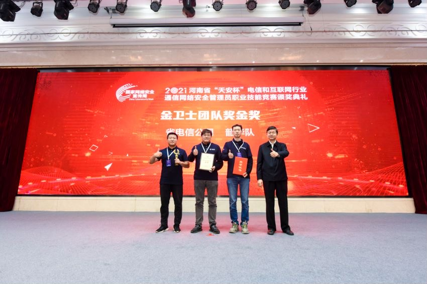 經(jīng)過(guò)激烈角逐,河南電信公司韶華隊(duì)、河南移動(dòng)公司青銅隊(duì)和河南聯(lián)通神機(jī)隊(duì)分獲“金衛(wèi)士”團(tuán)體金獎(jiǎng)、銀獎(jiǎng)和銅獎(jiǎng);張智偉等25人分別榮獲“金衛(wèi)士”個(gè)人一、二、三等獎(jiǎng)和優(yōu)勝獎(jiǎng)。省工業(yè)和信息化廳副廳長(zhǎng)田海濤、省委網(wǎng)信辦副主任蔡新民等與會(huì)領(lǐng)導(dǎo)為獲獎(jiǎng)選手頒獎(jiǎng)。