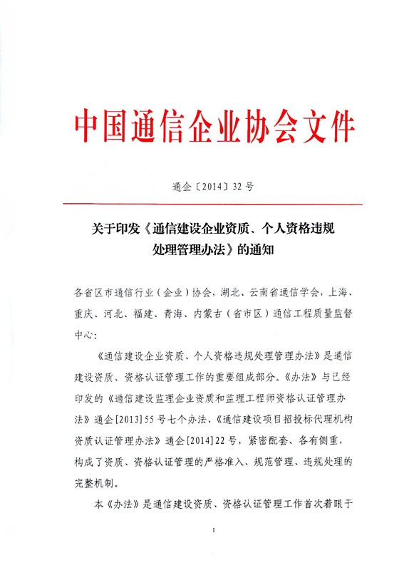 中國(guó)通信企業(yè)協(xié)會(huì)關(guān)于印發(fā)《通信建設(shè)企業(yè)資質(zhì)、個(gè)人資格違規(guī)處理管理辦法》的通知